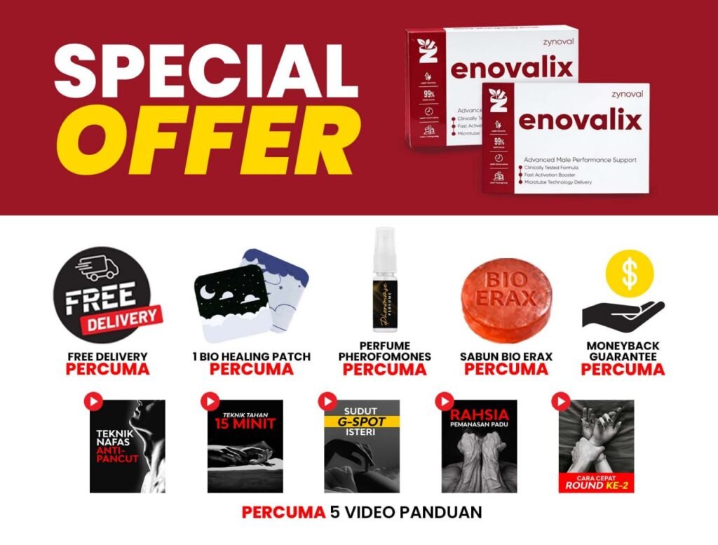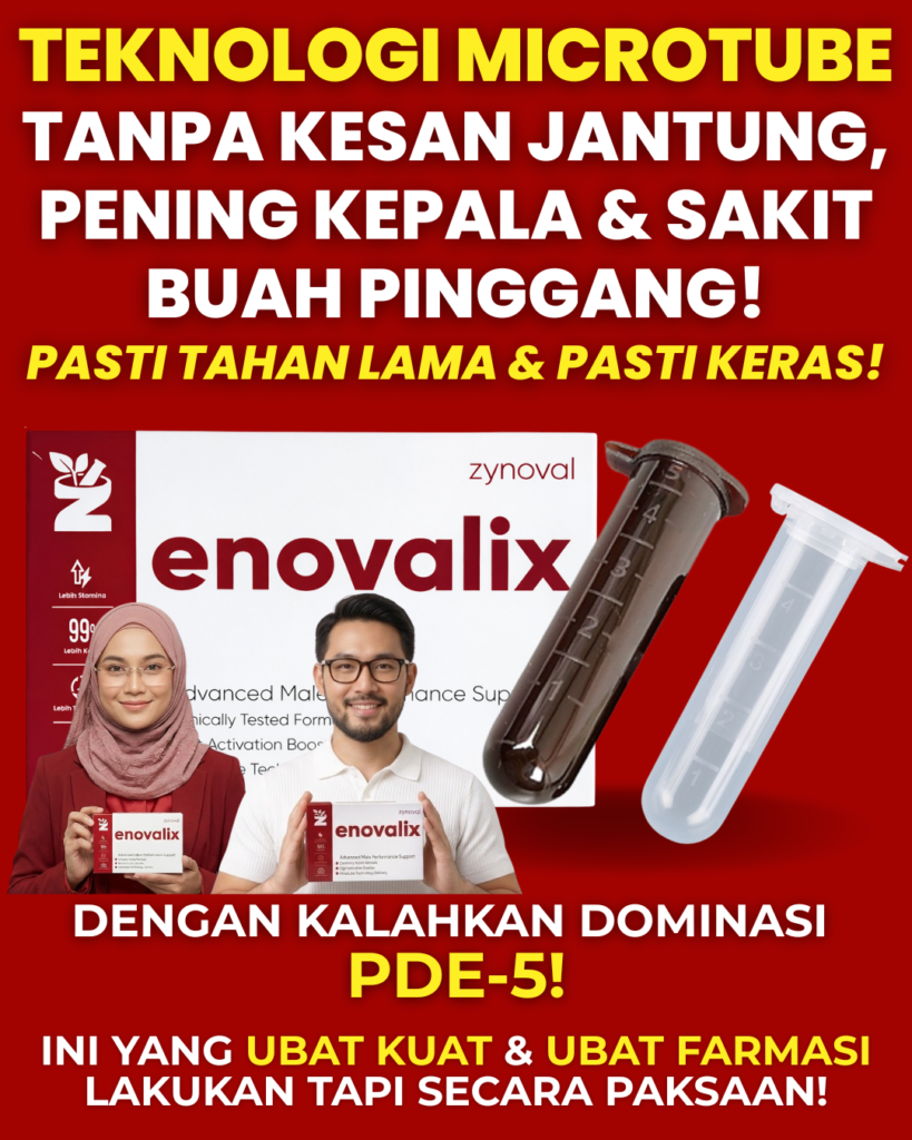Enovalix membantu dari sudut fisiologi—ia menyokong kawalan enzim PDE5 supaya ereksi tidak “mati” terlalu cepat. Bila ereksi keras dan stabil, anda secara automatik lebih mudah mengawal tempoh pancutan. Ia bukan ubat bius (kebas), jadi nikmat rasa tetap ada.