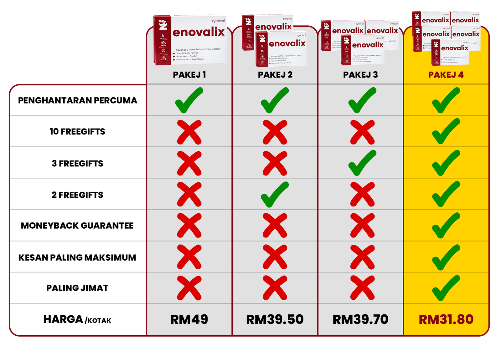 Untuk hasil yang lebih optimum, disarankan agar ENOVALIX diamalkan secara konsisten mengikut panduan (sama ada secara berkala atau on-demand) dan digabungkan dengan gaya hidup sihat. Sila pilih pakej yang paling sesuai dengan keperluan dan matlamat kesihatan anda.
